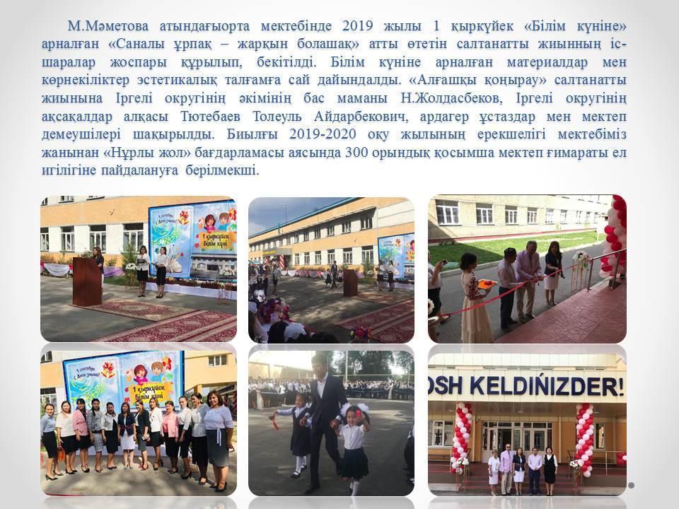 02 сентябрь 2019 0 1 2 3 4 5 1 қыркүйек "Білім күніне" арналған "Саналы ұрпақ-жарқын болашақ" атты салтанатты жиын жоғарғы деңгейде өтті