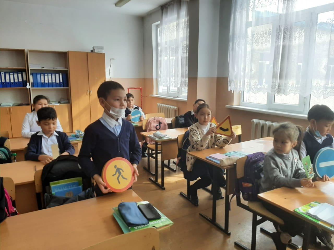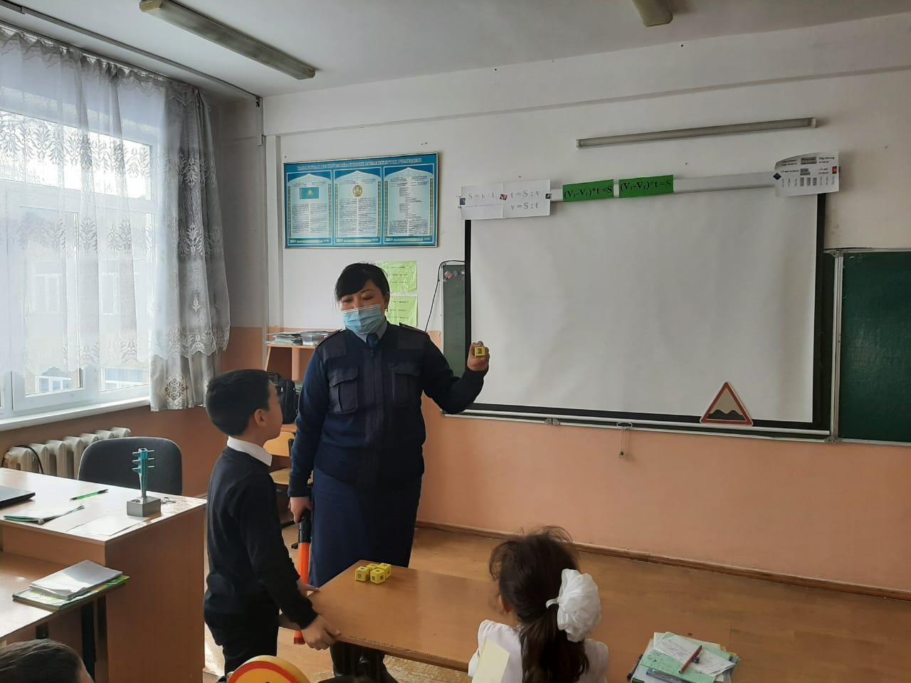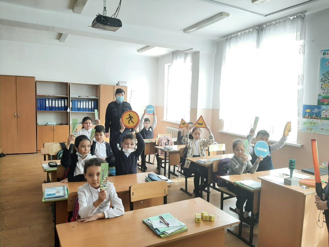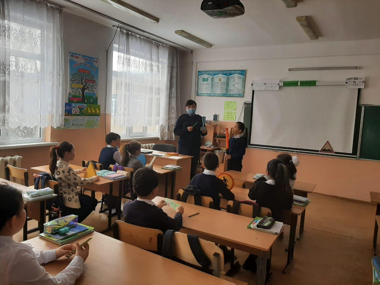 Қарасай ауданы ЖПҚ ЮПТИ бөлімінің полиция капитаны Ж. Темырханова мен полиция капитаны А.Анаркулова , тәрбие орынбасарлары М.Манапбай мен А.Орынбаева 1-4 сынып оқушыларына Жолда жүру ережесін есте сақтауға, оқушыларға жол белгілерін неше түрі бар, оны білу не үшін қажет, бағдаршамның, жол белгілерінің атқаратын қызметі қандай екенін үйрету арқылы барлығымызға ортақ қойылған тәртіпті бұзбауға үйрете отырып түсіндіру жұмыстарын жүргізді. Жол белгілерімен таныстыра отырып,бағдаршамды дұрыс түсіну,жолдан өткенде құлаққапты алып тастау т.б ескертпелерді таныстырылым,көрнекі құралдар арқылы түсіндіріп өтті.
