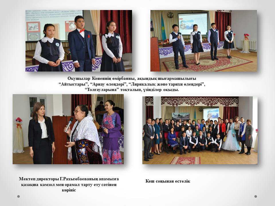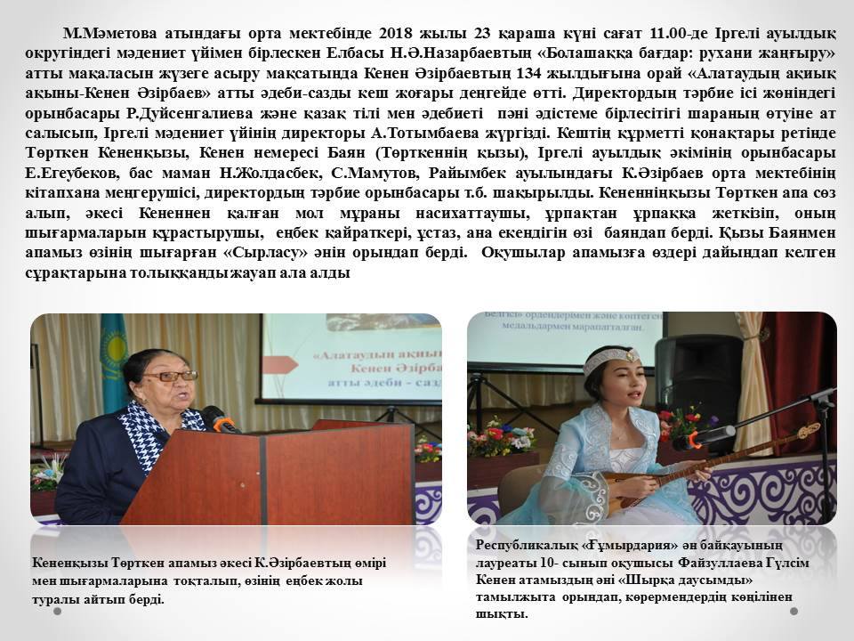 Елбасы Н.Ә.Назарбаевтың «Болашаққа бағдар: рухани жаңғыру» атты мақаласын жүзеге асыру мақсатында Кенен Әзірбаевтың 134 жылдығына орай «Алатаудың ақиық ақыны-Кенен Әзірбаев» атты әдеби-сазды кеш жоғары деңгейде өтті » М.Маметова атындағы орта мектеп