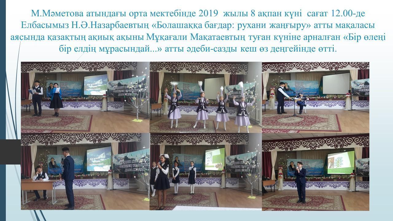 Қазақтың ақиық ақыны Мұқағали Мақатаевтың туған күніне арналған «Бір өлеңі бір елдің мұрасындай...» атты әдеби-сазды кеш өз деңгейінде өтті » М.Маметова атындағы орта мектеп