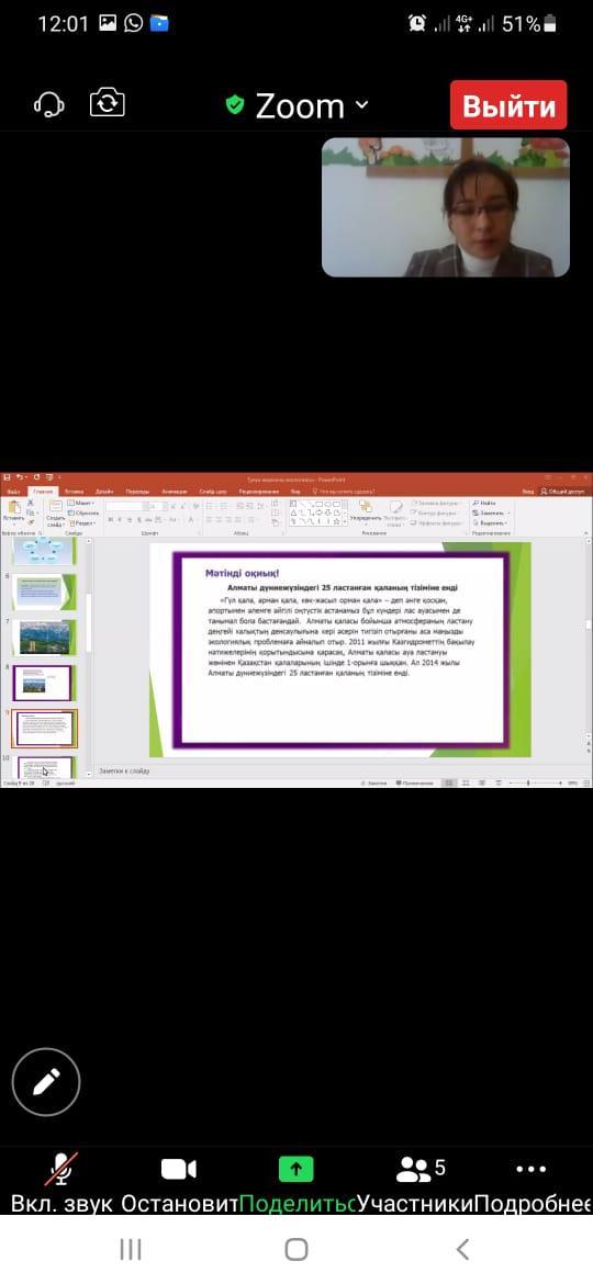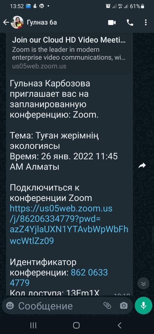 М.Мәметова атындағы орта мектепте 10.12.2021 ж күні «Туған жерімнің экологиясы» тақырыбында сынып сағаттары өтті. «Ерте жастан экологиялық мәдениет» экологиялық мәдениетті қалыптастыруға, қоршаған әлемге ұқыпты қарауға ықпал етеді Қоршаған ортаның сапасы және ластануы туралы, сыртқы ортаның барлық факторларының бір-біріне байланыстылығы, оның ішінде біз туған жерінің экологиясын білуге үйрету. 6 А сынып жетекшісі Гульназ Карбозова осы тақырыпта оқушылармен zoom платформасында қашықтықтан өтті.Тәрбие сағаты жүйелі құрылған.Жалпы экология туралы мәлімет бере отырып,оқушыларға өздері тұратын жердің экологиясы жайлы мәліметтер жинақтатқан