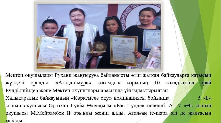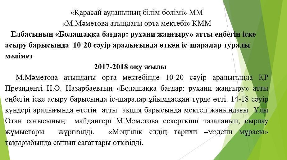 Елбасының «Болашаққа бағдар: рухани жаңғыру» атты еңбегін іске асыру барысында 10-20 сәуір аралығында өткен іс-шаралар туралы мәлімет » М.Маметова атындағы орта мектеп