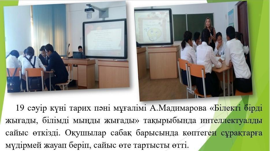М.Маметова атындағы орта мектеп » Іс-шаралар » Елбасының «Болашаққа бағдар: рухани жаңғыру» атты еңбегін іске асыру барысында 10-20 сәуір аралығында өткен іс-шаралар туралы мәлімет