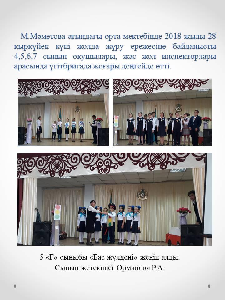 2018 жылы 28 қыркүйек күні жолда жүру ережесіне байланысты 4,5,6,7 сынып оқушылары, жас жол инспекторлары арасында үгітбригада жоғары деңгейде өтті » М.Маметова атындағы орта мектеп