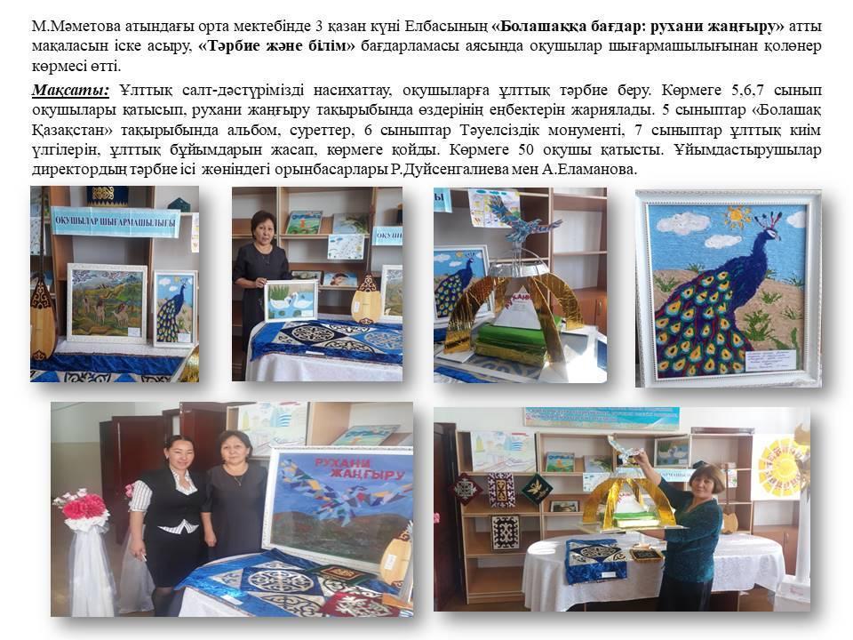 3 қазан күні Елбасының «Болашаққа бағдар: рухани жаңғыру» атты мақаласын іске асыру, «Тәрбие және білім» бағдарламасы аясында оқушылар шығармашылығынан қолөнер көрмесі өтті