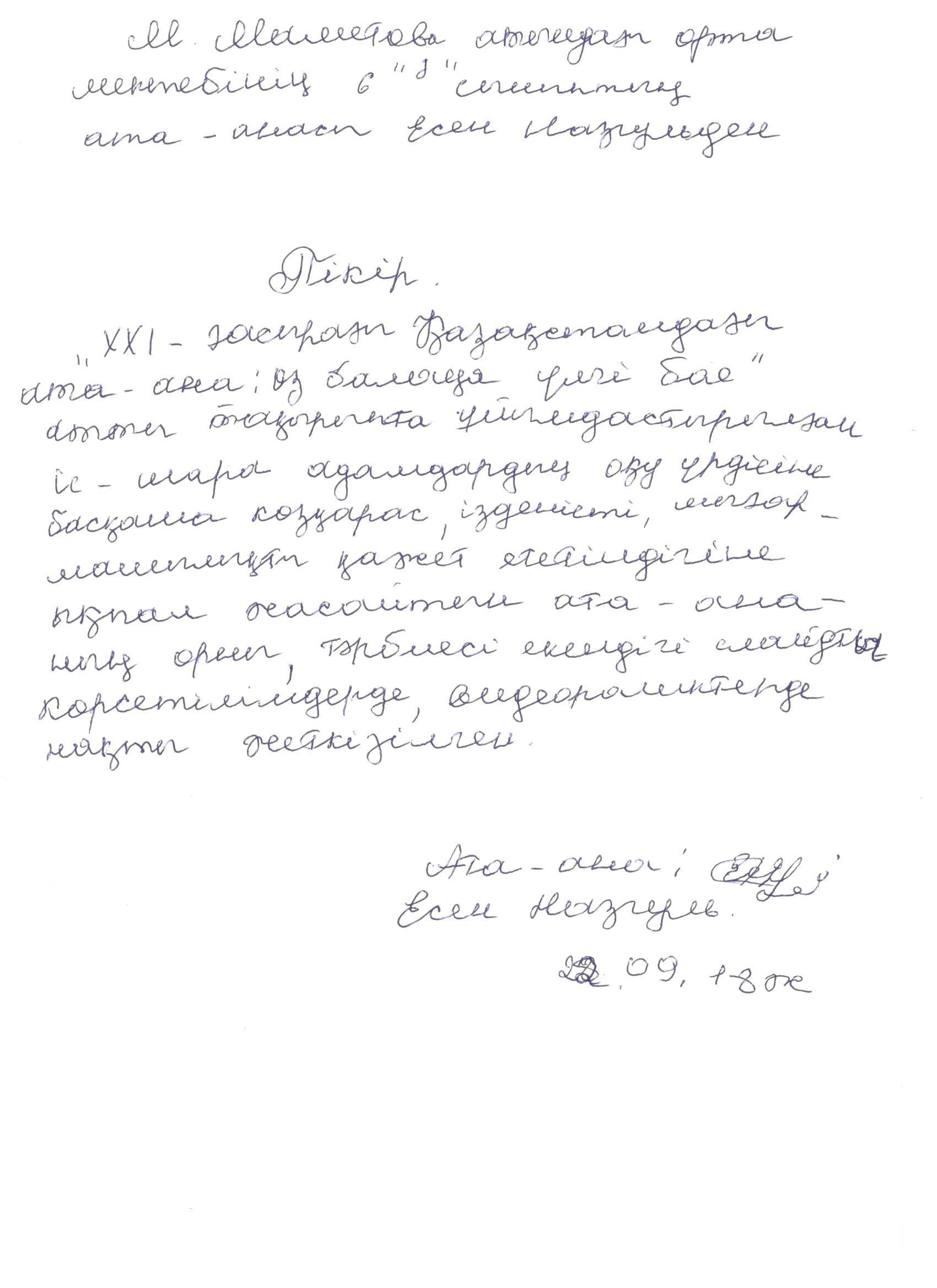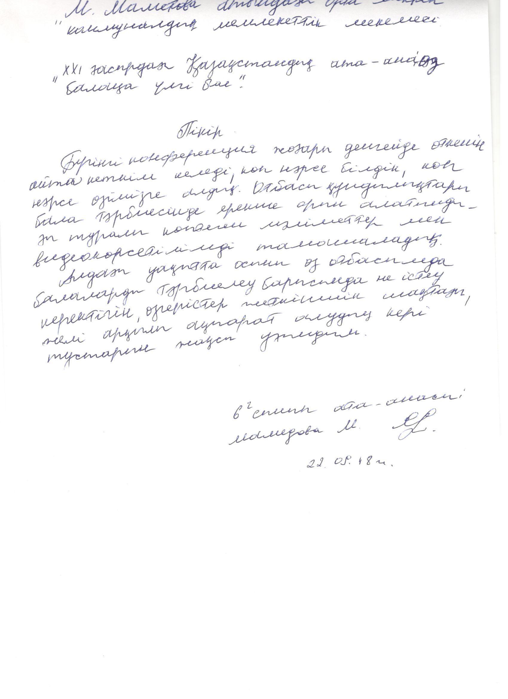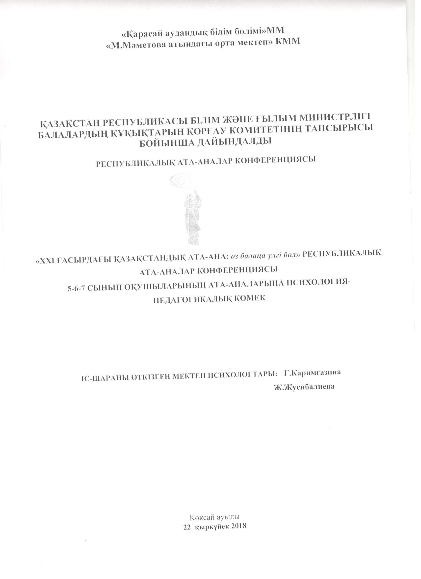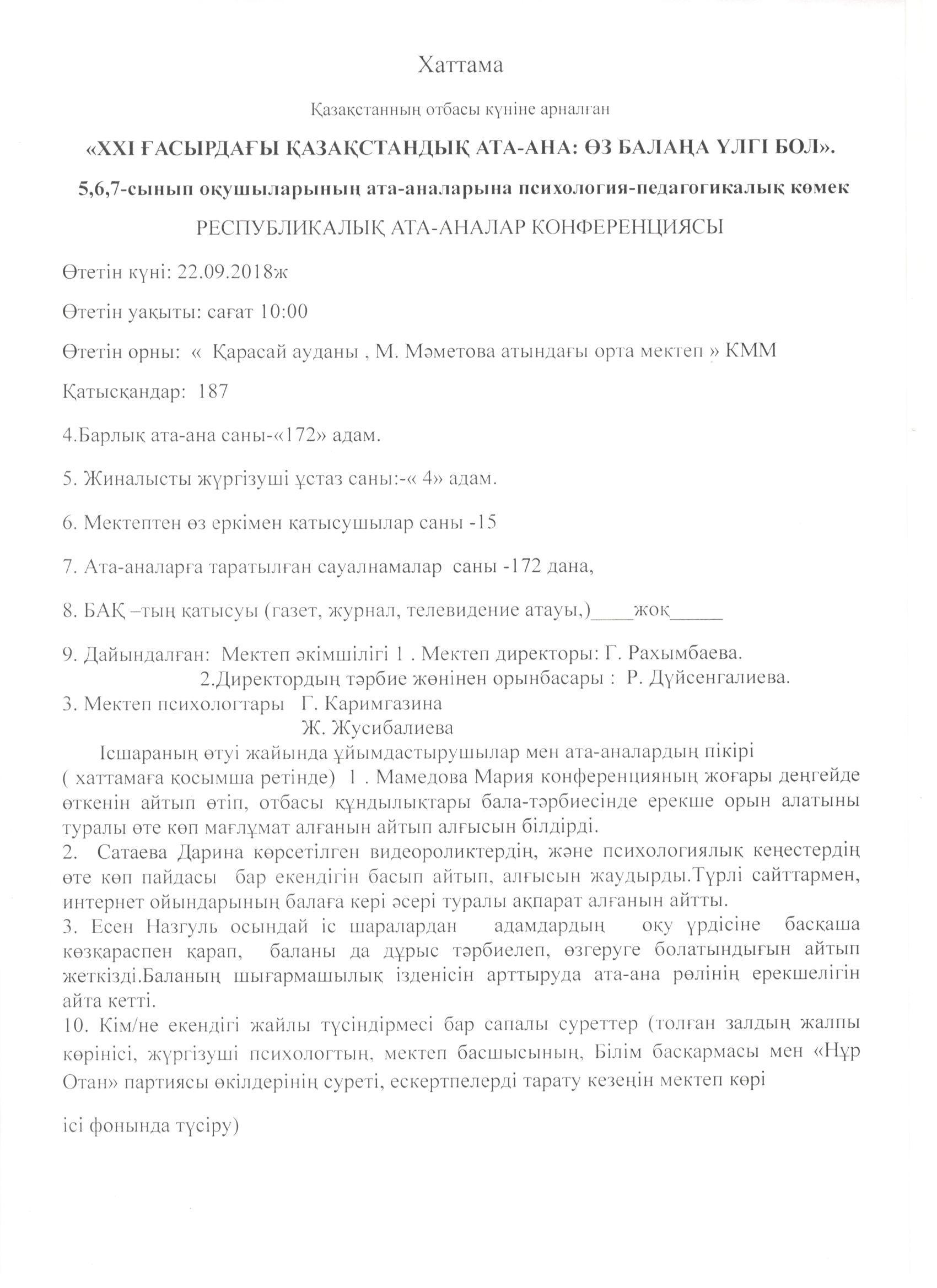 08.09-22.09 аралығында 1-11 сынып оқушыларының ата - аналарына "XXI ҒАСЫРДАҒЫ ҚАЗАҚСТАНДЫҚ АТА-АНА: ӨЗ БАЛАҢА ҮЛГІ БОЛ" атты республикалық ата-аналар конференциясы өтті » М.Маметова атындағы орта мектеп