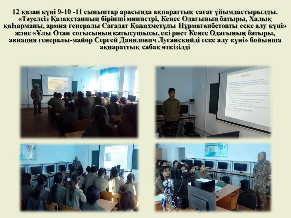 12 қазан күні 9-10 -11 сыныптар арасында ақпараттық сағат ұйымдастырылды