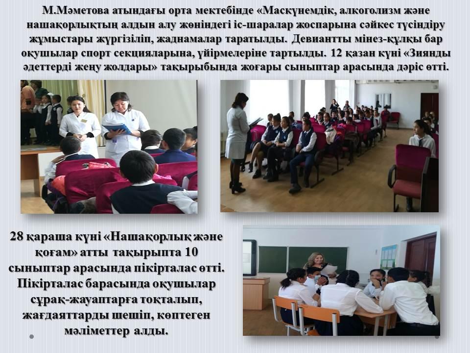 М.Мәметова атындағы орта мектебінде «Маскүнемдік, алкоголизм және нашақорлықтың алдын алу жөніндегі іс-шаралар жоспарына сәйкес түсіндіру жұмыстары жүргізіліп, жаднамалар таратылды