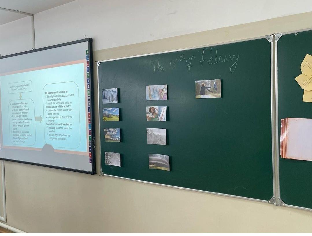 Жас мамандар апталығының алғашқы аптасының алғашқы сабағын ағылшын тілі пәнінің мұғалімі Дәмен Гүлжанат 15.02 күні "Weather conditions" атты тақырыпта ашық сабағын өтізді. Суреттермен тірек сөздерді сәйкестендіру арқылы тақырыпты ашып, оқушыларды екі топқа бөле отырып сабағын бастады. Сабақта "Сиқырлы қобдиша", "Сөйлемді жалғастыр" және Қазақстан картасын оқушыларға беру арқылы қалалардың ауа -райын болжау, бейнежазба көрсету сияқты тиімді әдіс- тәсілдерді қолдана отырып, сабақты қызықты өткізе білді. Сабақ өз мақсатына жетті.