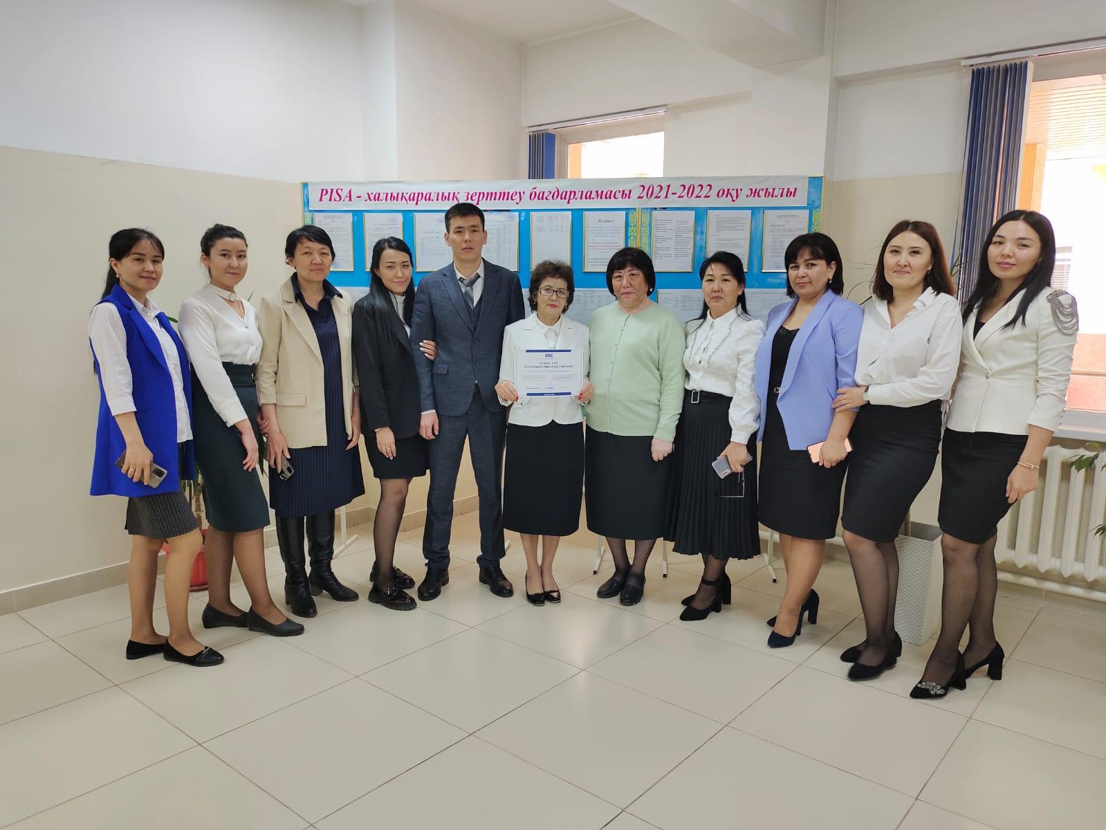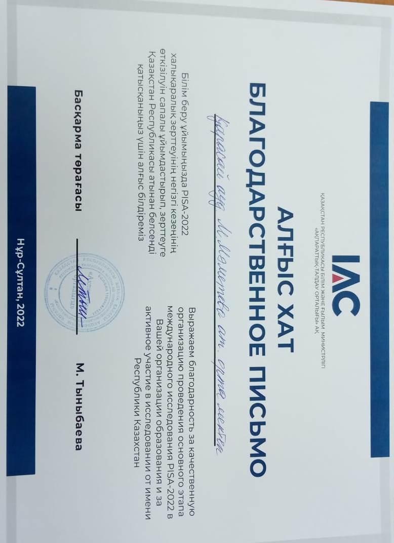 Білім беру ұйымыңыздаPISA-2022 халықаралық зерттеуінің негізгі кезеңінің өткізілуін сапалы ұйымдастырып, зерттеуге Қазақстан Республикасы атынан белсенді қатысқаны үшін мектеп директоры Бейгазова Гульназ Жандаровна алғыс хатпен марапатталды. PISA-2022 халықаралық зерттеуінің негізгі кезеңіне дайындық бойынша облыс үйлестірушілерін, тест әкімшілерін және білім беру үйымы үйлестірушілерін оқытуға арналған онлайн семинарға қатысқаны үшін мектеп директорының әдістемелік ісі жөніндегі орынбасары Ибраева Жанат Кулахметовнаға сертификат табысталды.