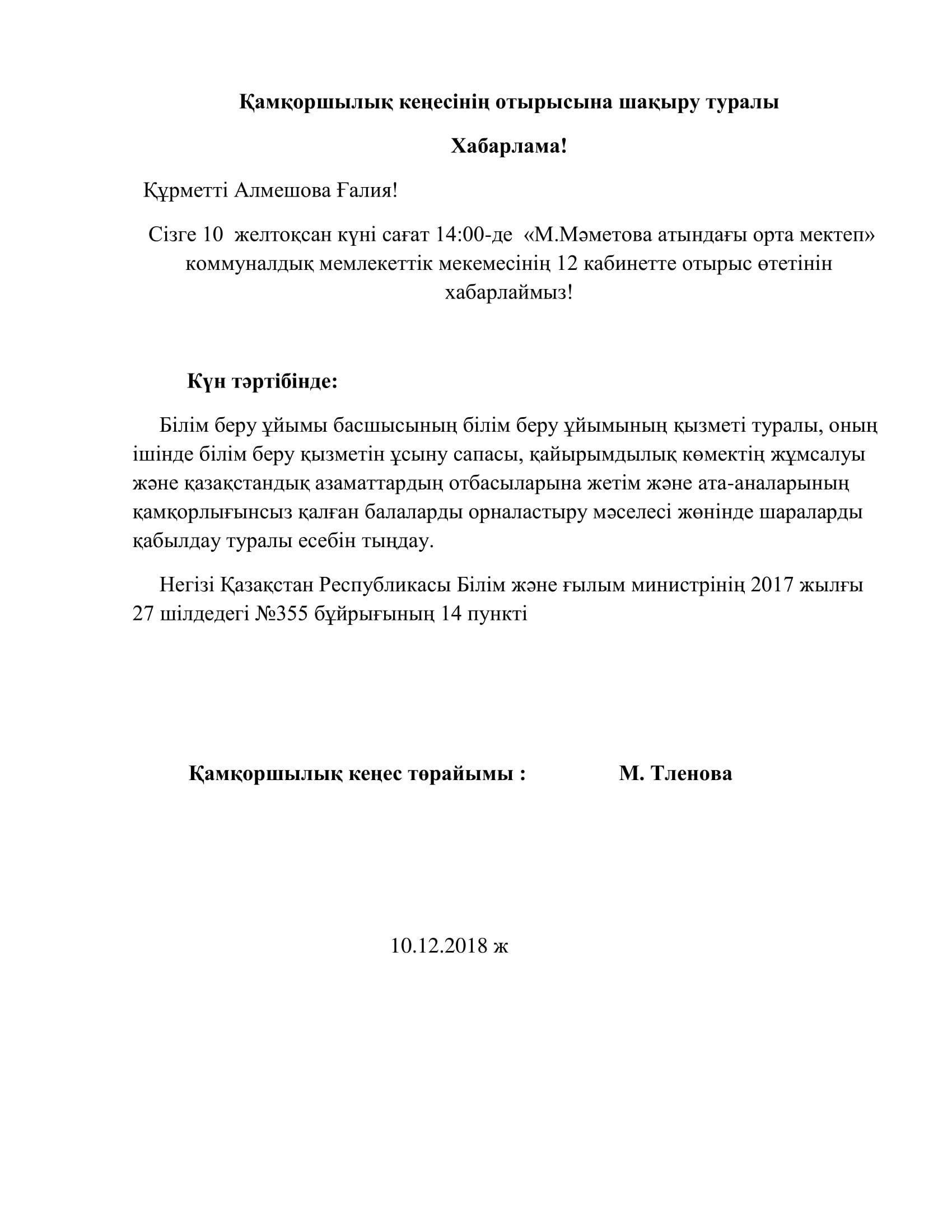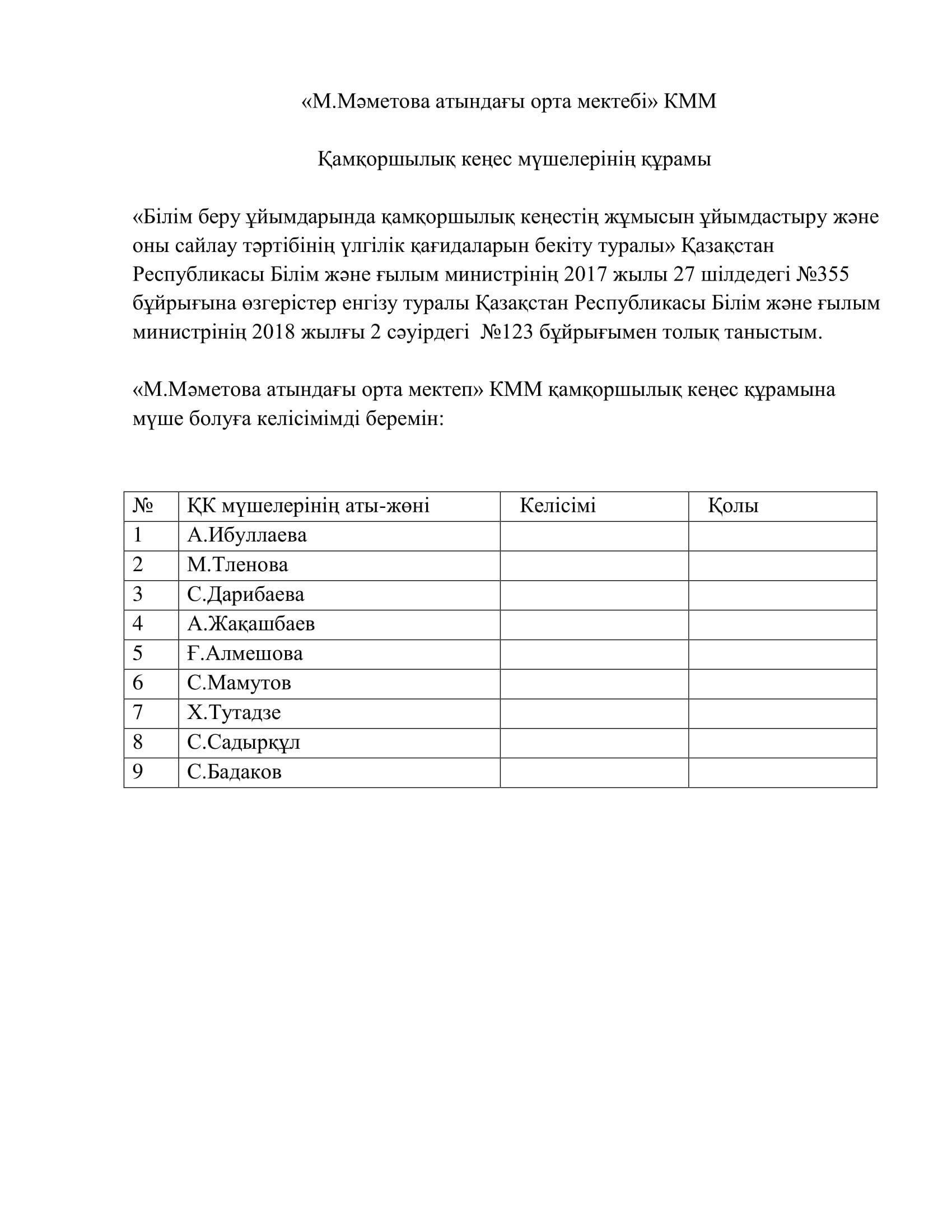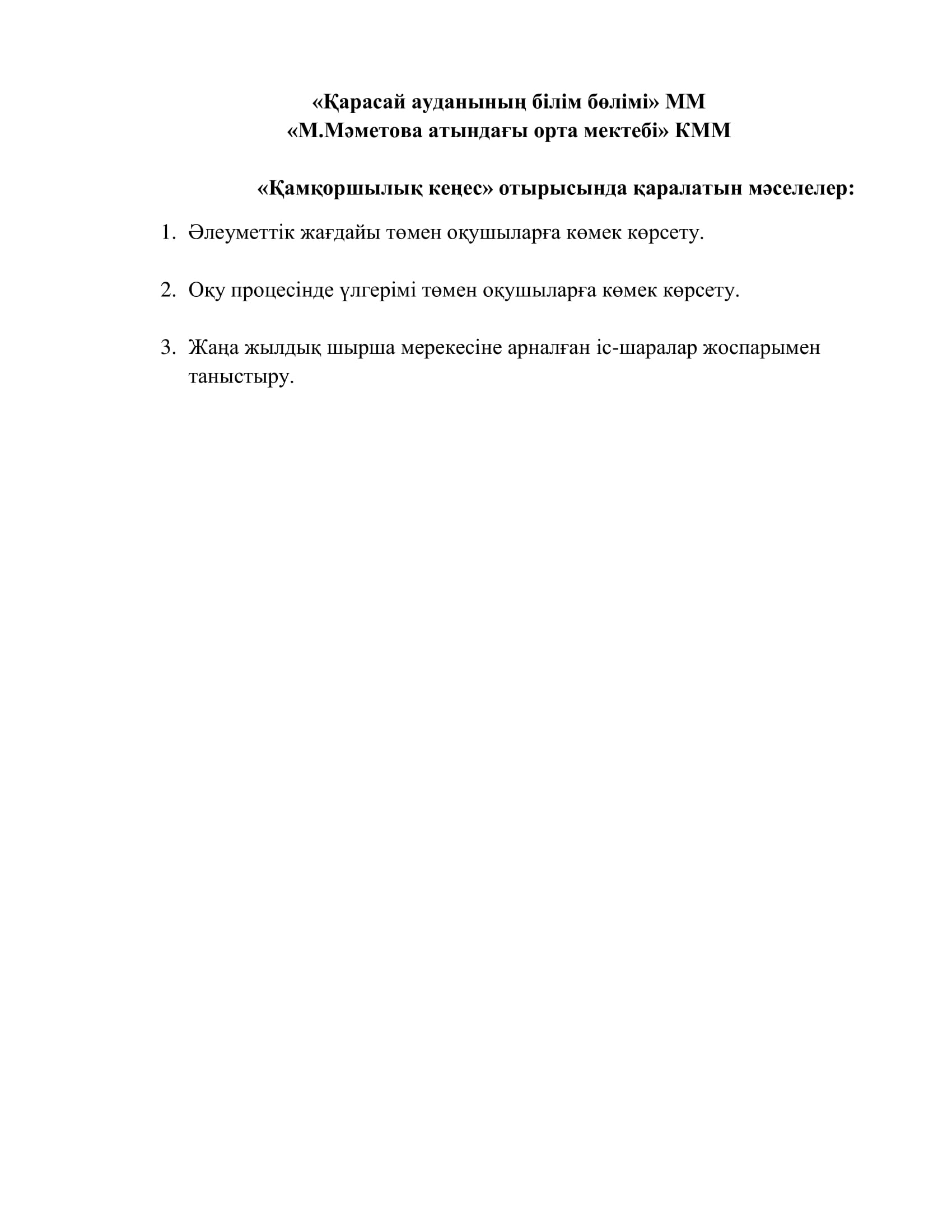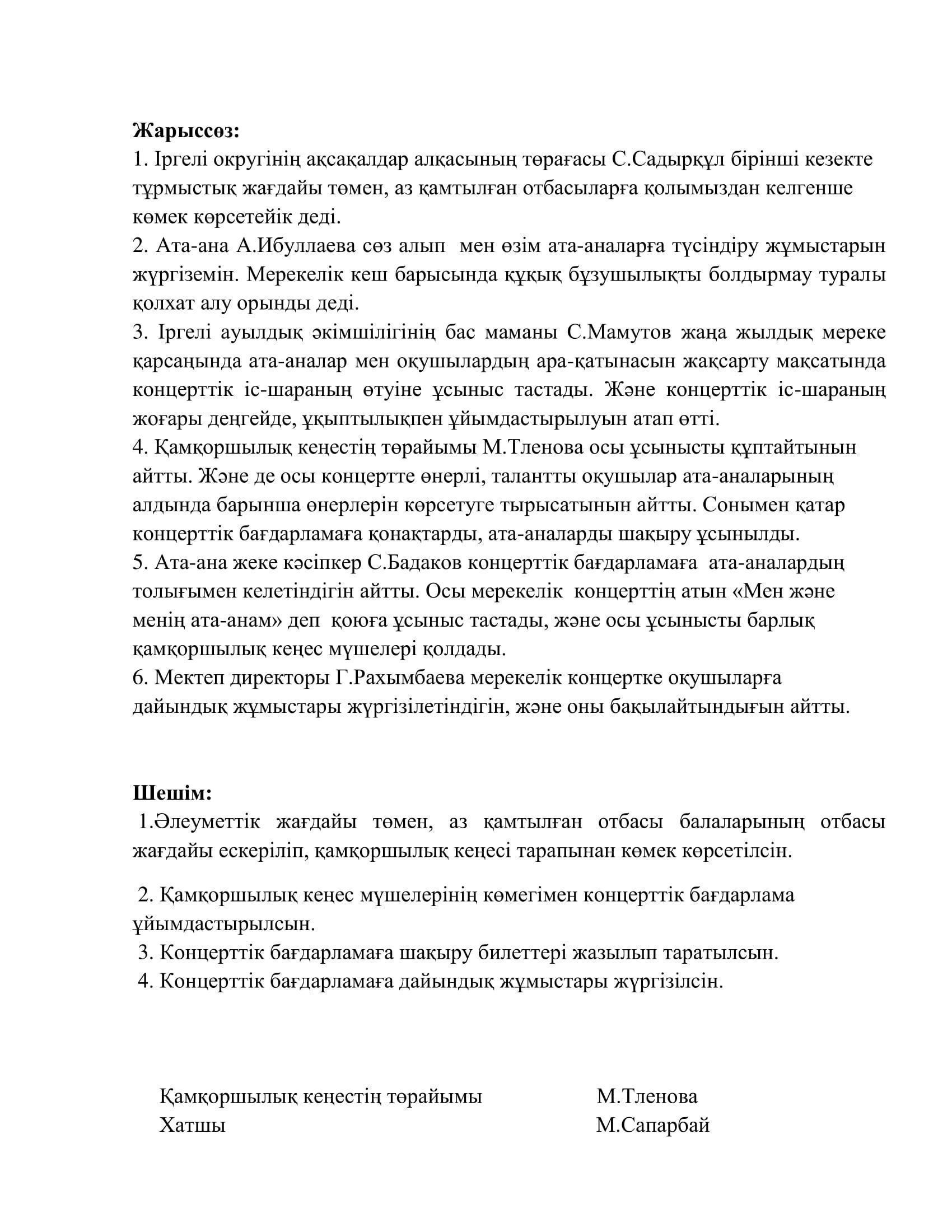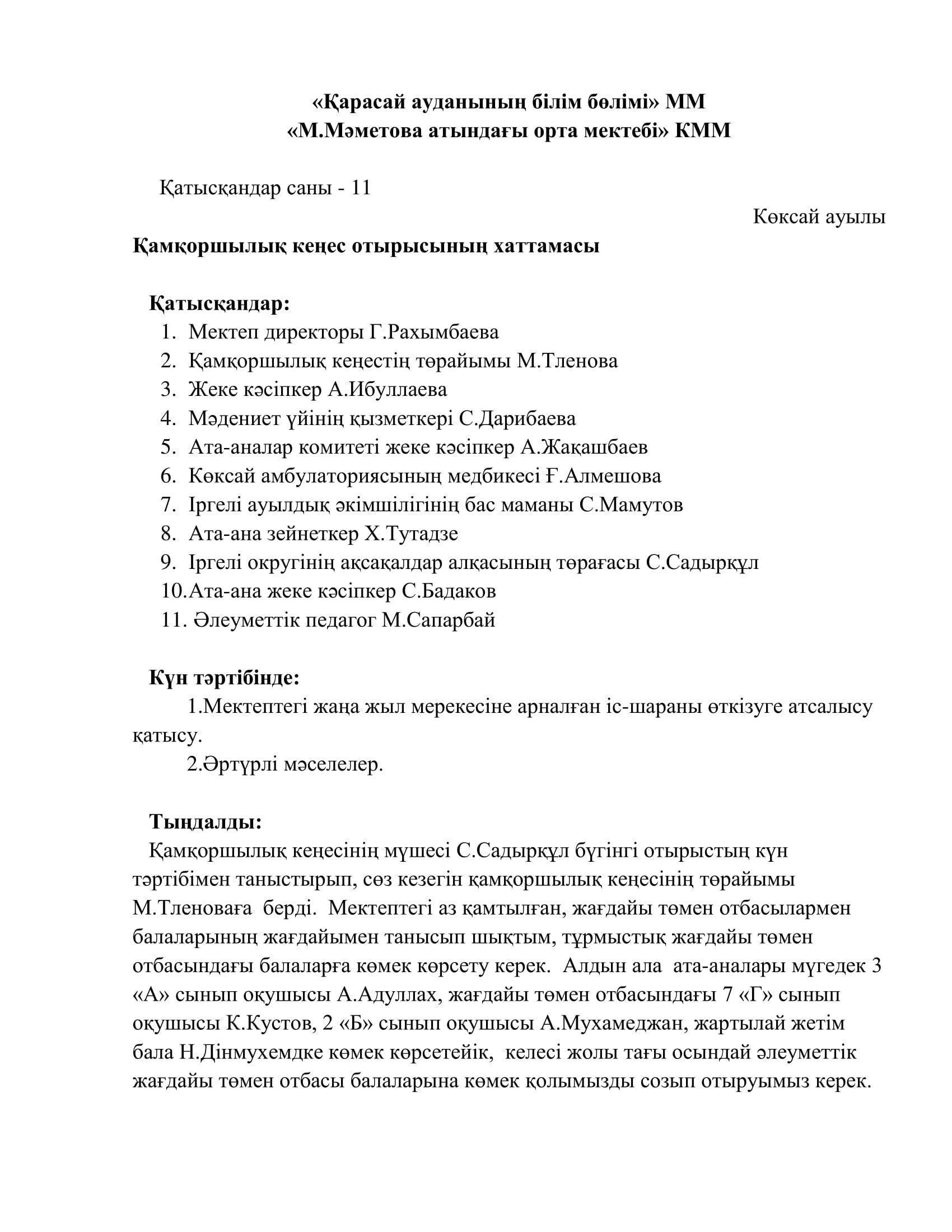 Қамқоршылық кеңес отырысының хаттамасы » М.Маметова атындағы орта мектеп