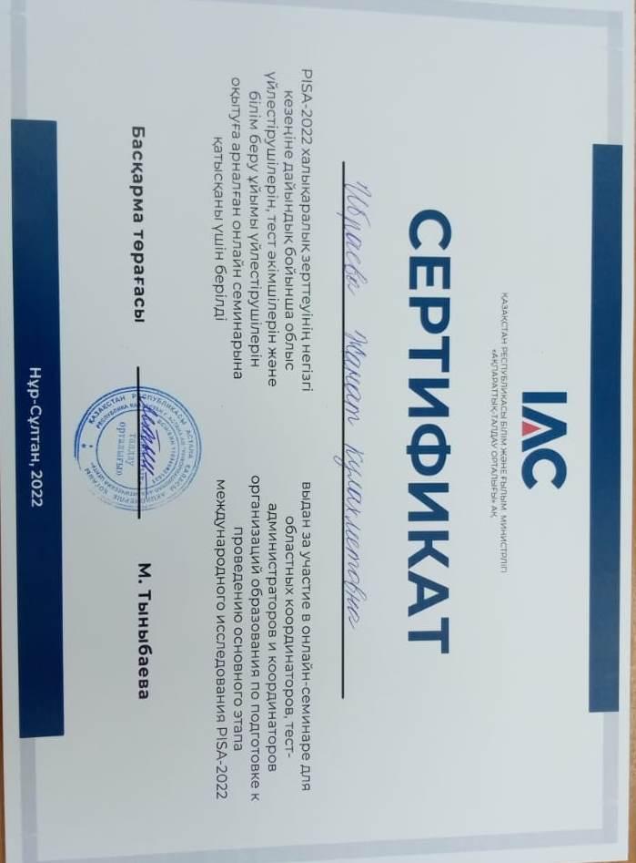 Білім беру ұйымыңыздаPISA-2022 халықаралық зерттеуінің негізгі кезеңінің өткізілуін сапалы ұйымдастырып, зерттеуге Қазақстан Республикасы атынан белсенді қатысқаны үшін мектеп директоры Бейгазова Гульназ Жандаровна алғыс хатпен марапатталды. PISA-2022 халықаралық зерттеуінің негізгі кезеңіне дайындық бойынша облыс үйлестірушілерін, тест әкімшілерін және білім беру үйымы үйлестірушілерін оқытуға арналған онлайн семинарға қатысқаны үшін мектеп директорының әдістемелік ісі жөніндегі орынбасары Ибраева Жанат Кулахметовнаға сертификат табысталды.